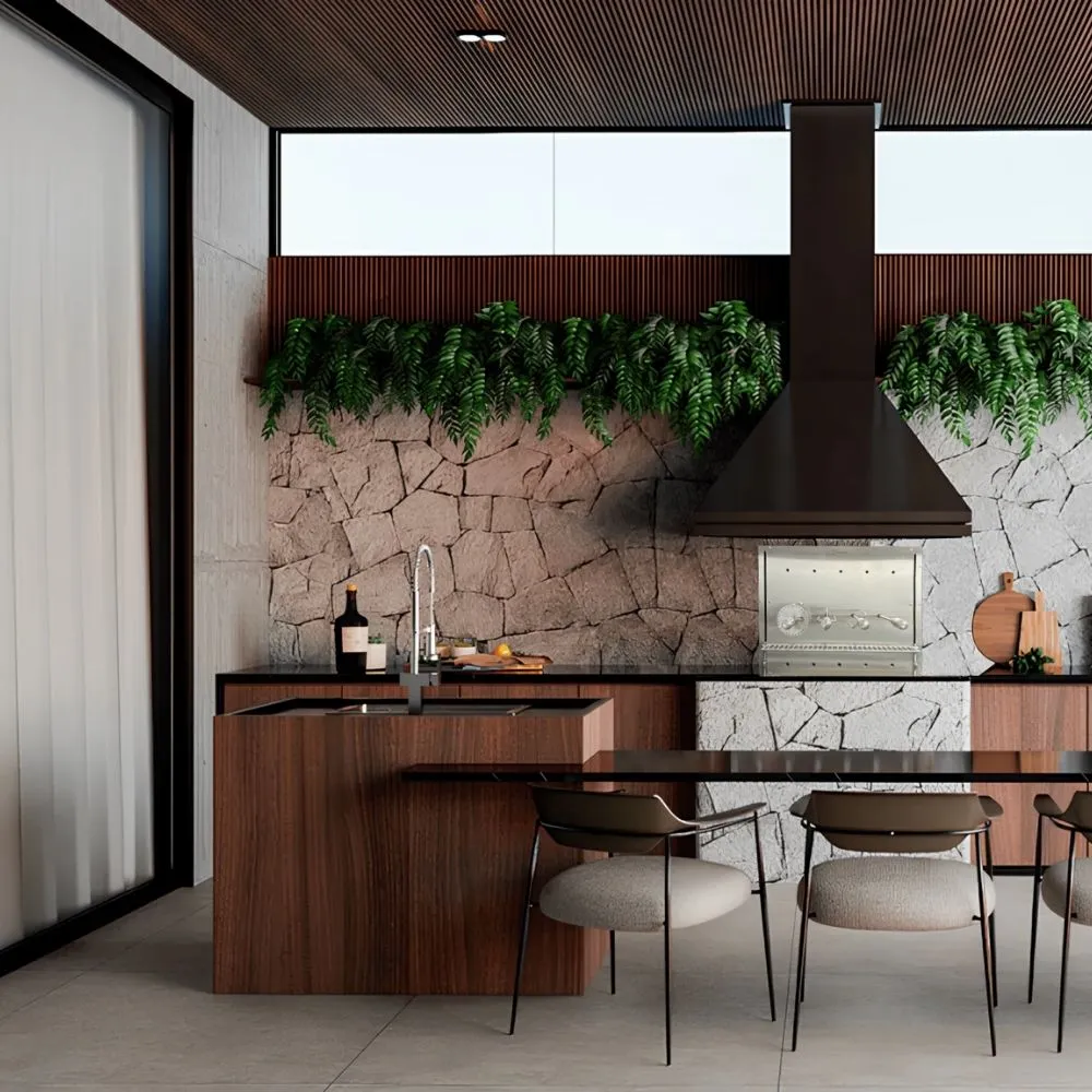 Churrasqueira giratória motorizada, com controle remoto para acionamento dos espetos e da grelha elevatória.