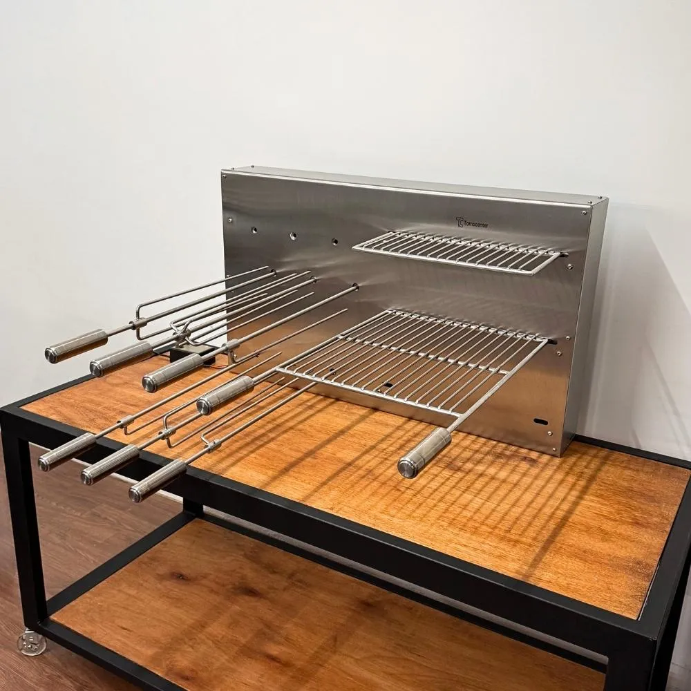 A churrasqueira já vai completa, com grelhas e espetos.