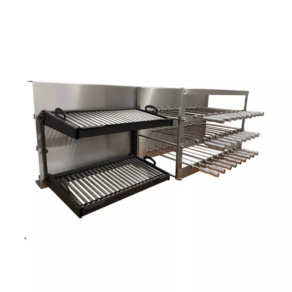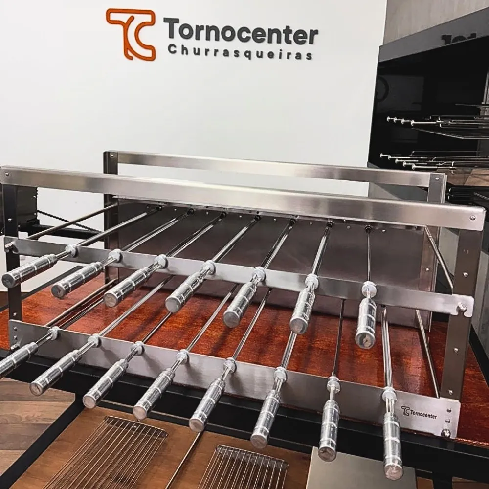 Acompanha: 26 espetos em inox cabo térmico (sendo 01 espeto para cupim e carnes maiores, 01 espeto de coração, 02 espetos com acessórios triplos e o restante simples). Engrenagens em aço A36, cortadas a laser, com embuchamento duplo em bronze na parte traseira.