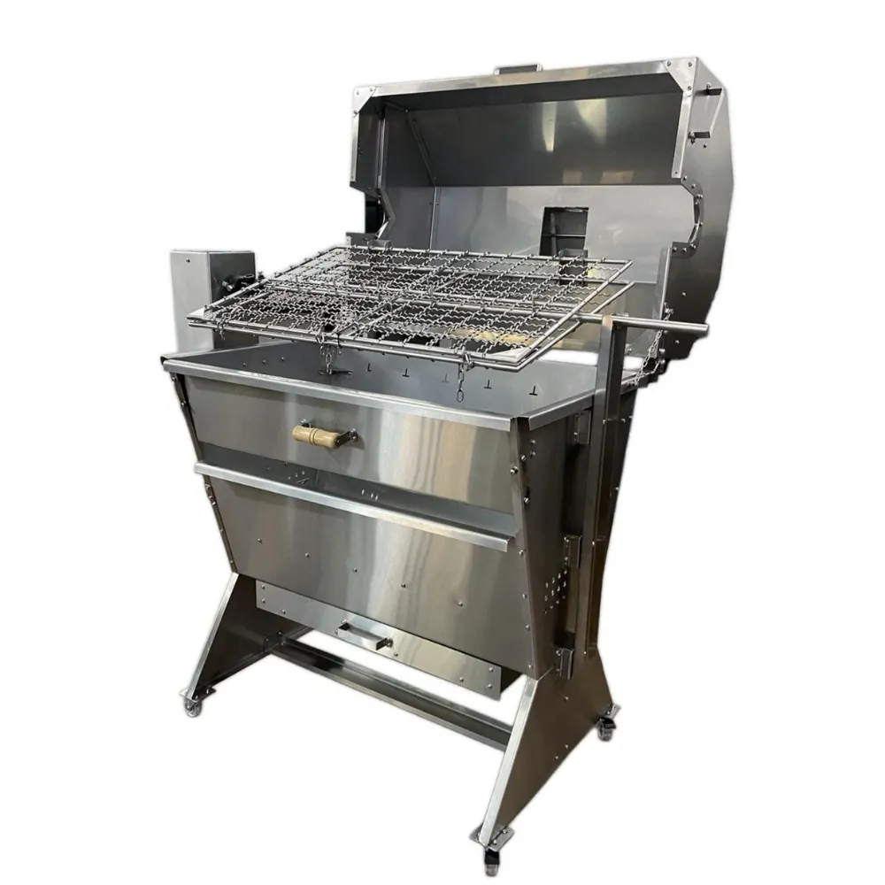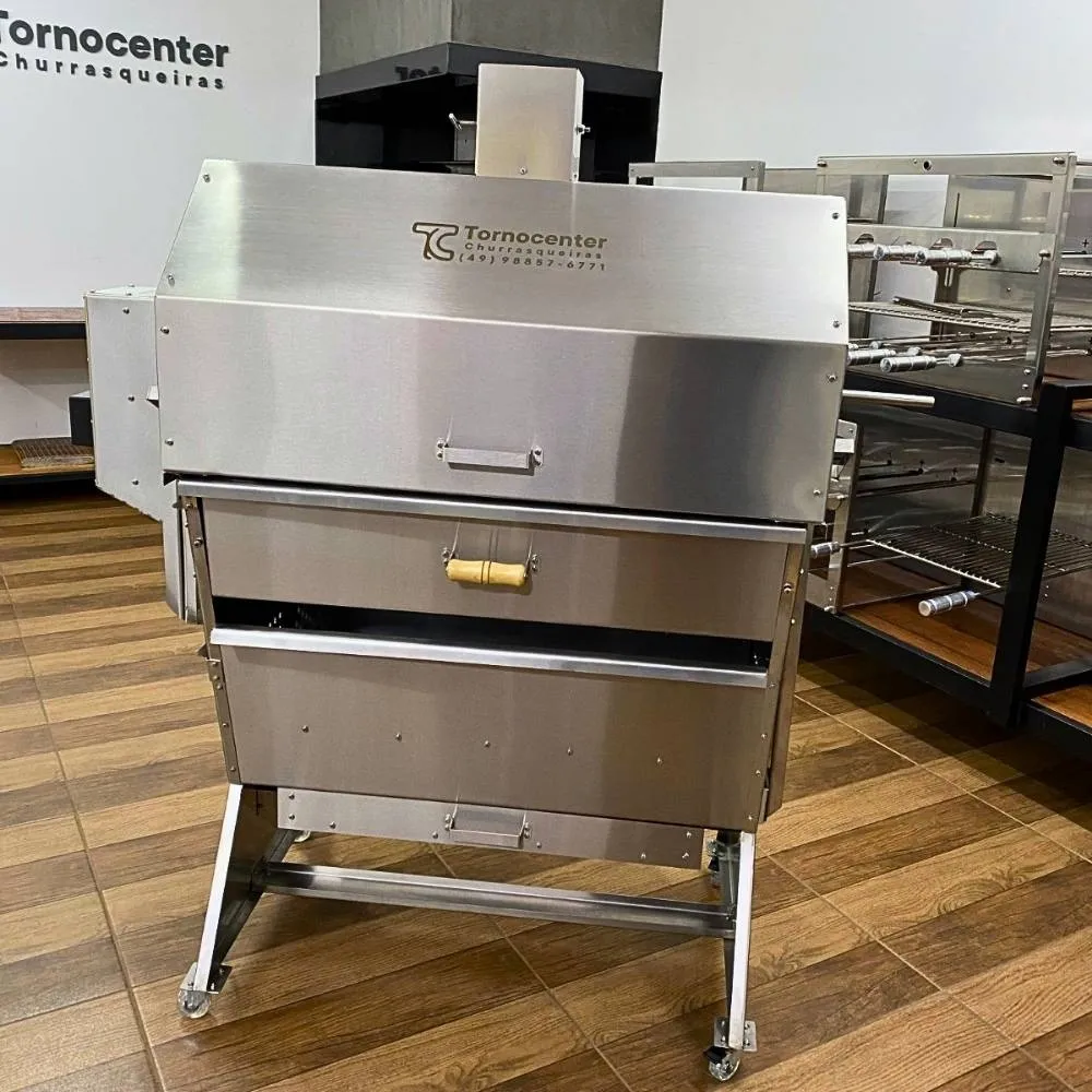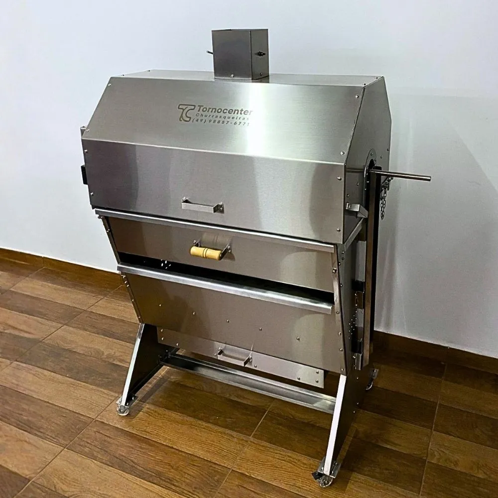 Em inox 304 com a espessura da chapa medindo 1,2mm, super fácil de limpar. Com cinzeiro deslizante e aberturas para cair as cinzas. Tem aberturas nas laterais para melhor controle de calor.