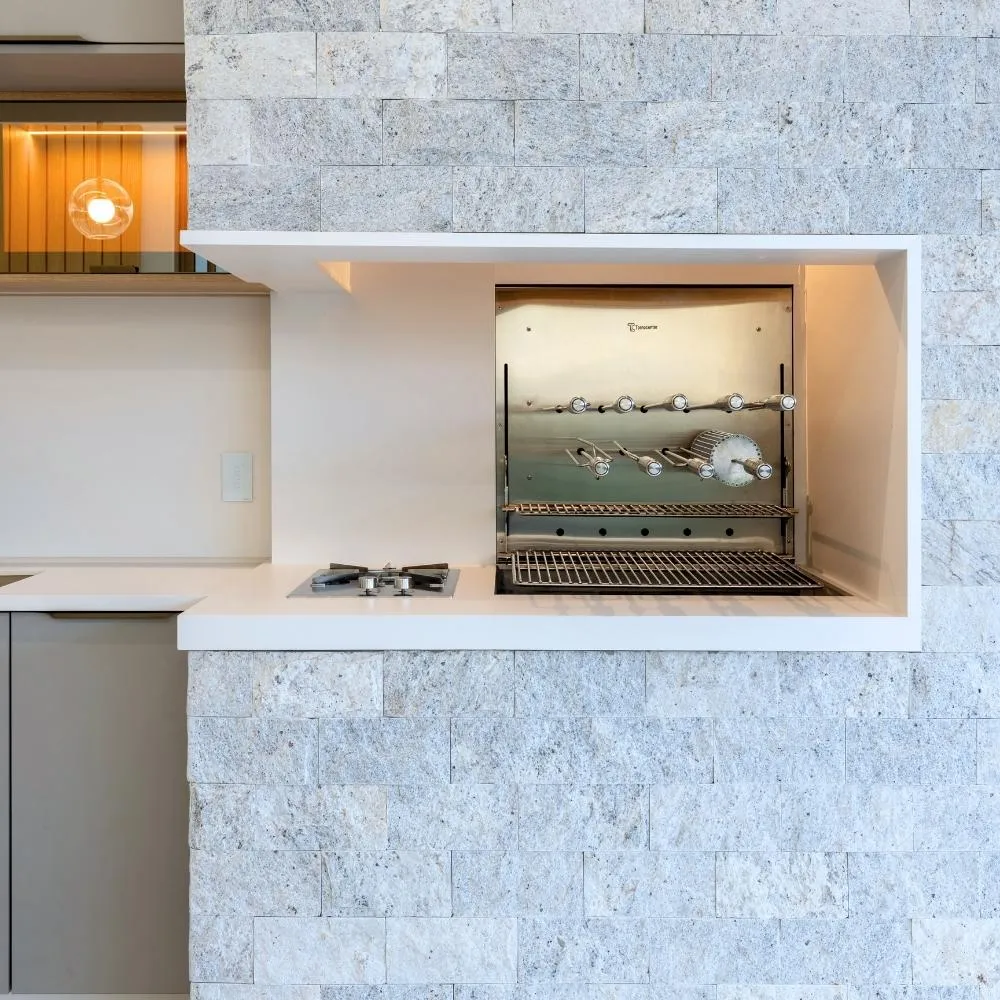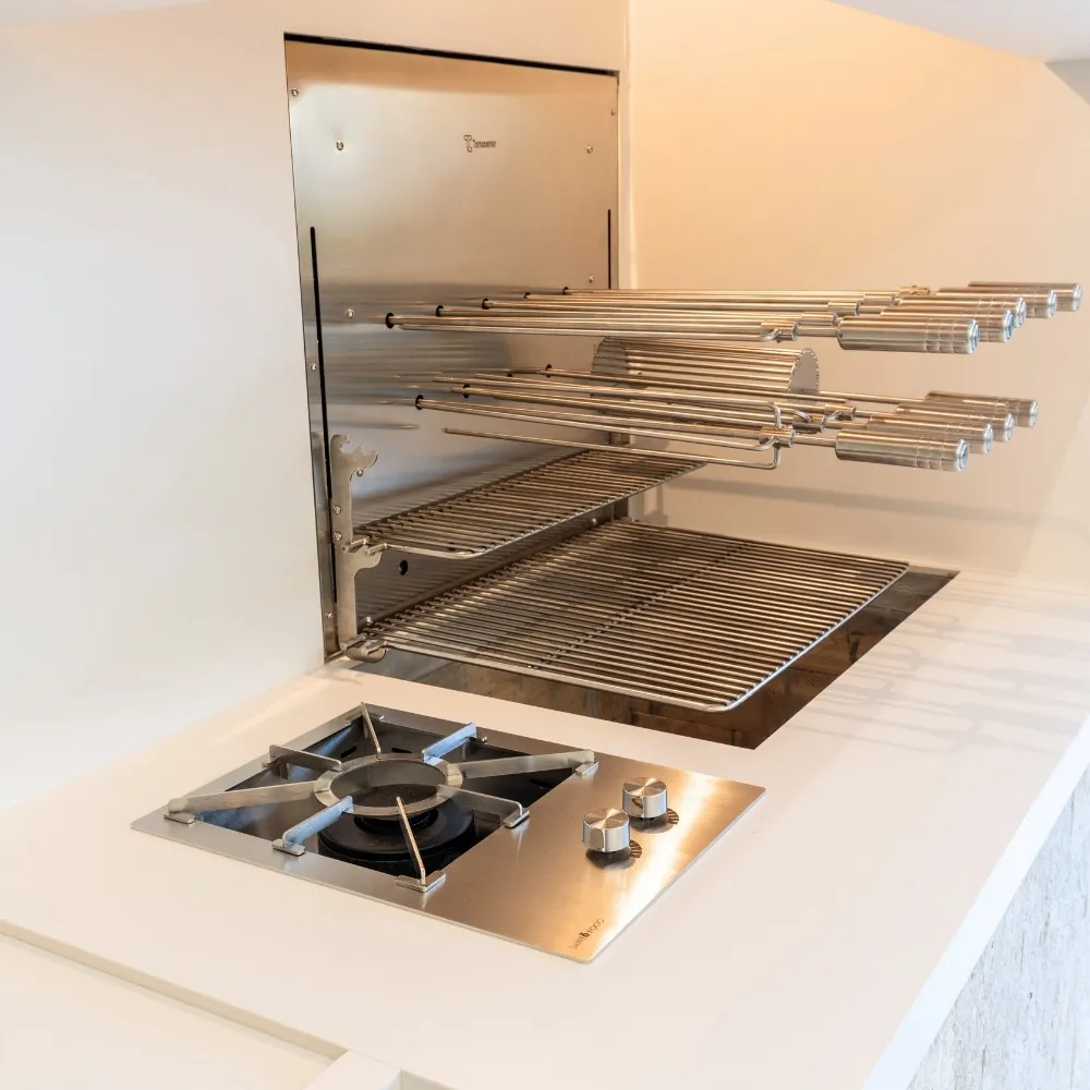 Churrasqueira giratória motorizada, com controle remoto para acionamento dos espetos e da grelha elevatória.