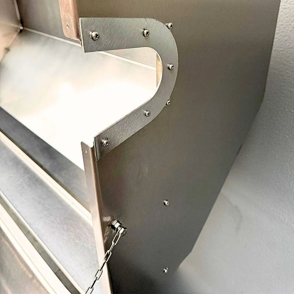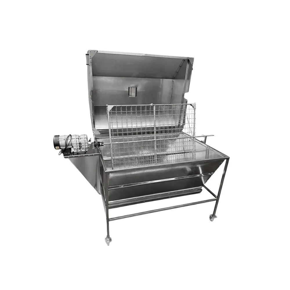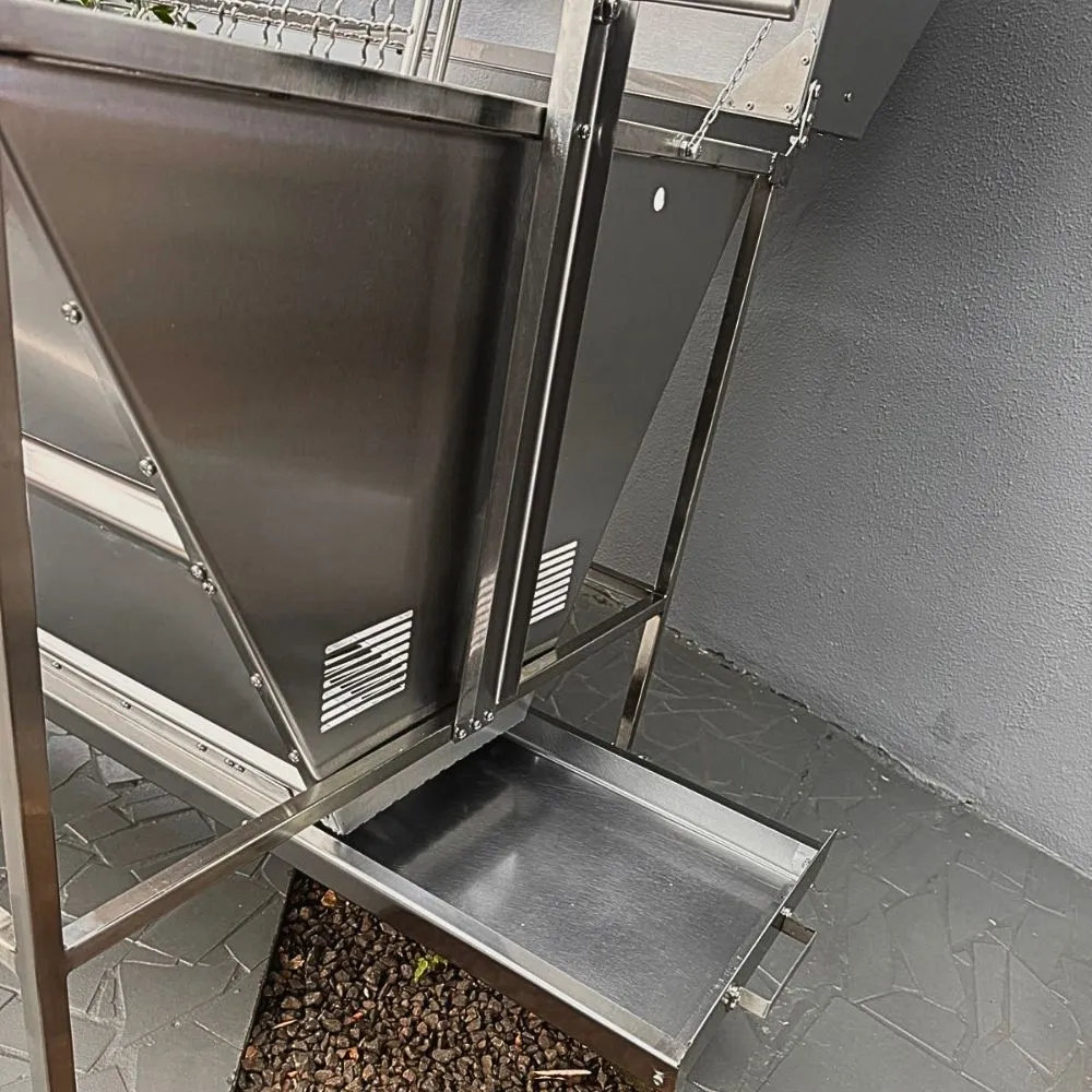 Churrasqueira para porco no rolete/cordeiro e costelão, em aço inox 304, chapa de 1,2mm espessura na estrutura e 0,8mm na cuba e cinzeiro.
